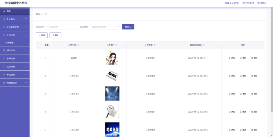 公告类型管理页面显示所有公告类型,在此页面既可以让管理员添加新的公告信息类型,也能对已有的公告类型信息执行编辑更新,失效的公告类型信息也能让管理员快速删除。