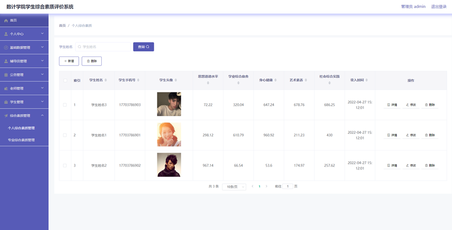 个人综合素质列表页面,此页面提供给管理员的功能有:查看个人综合素质、新增个人综合素质、修改个人综合素质、删除个人综合素质等。