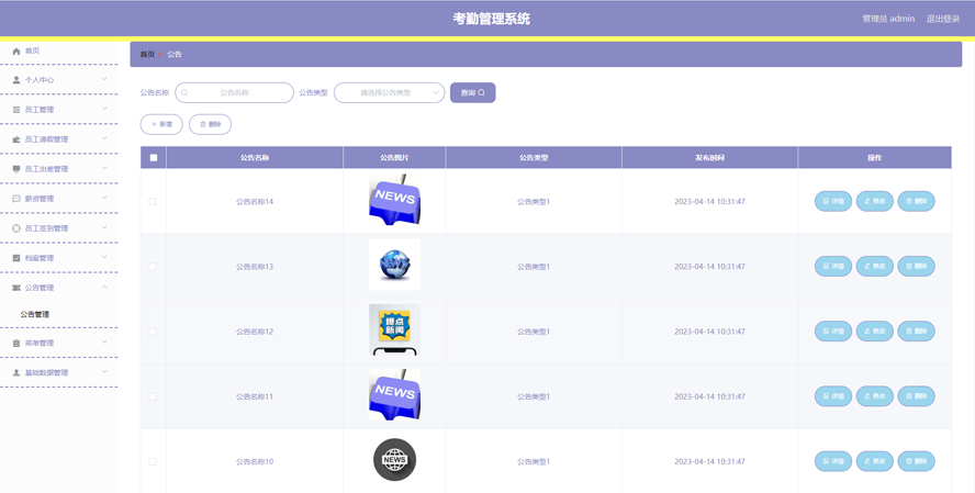 公告类型管理页面显示所有公告类型,在此页面既可以让管理员添加新的公告信息类型,也能对已有的公告类型信息执行编辑更新,失效的公告类型信息也能让管理员快速删除。